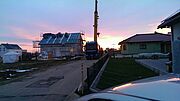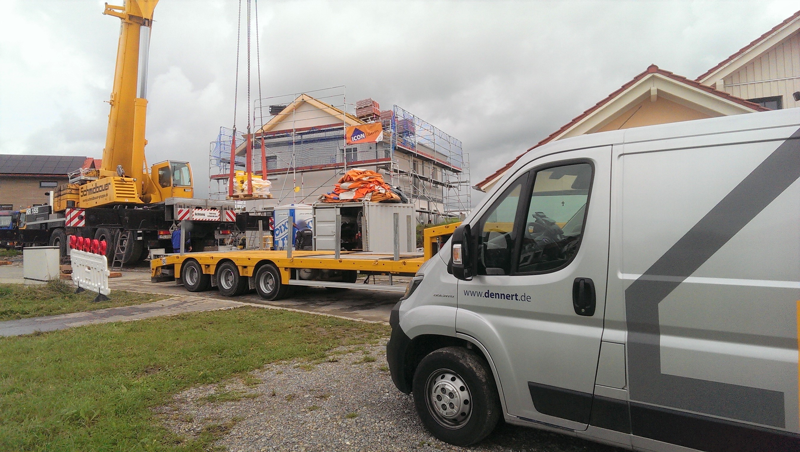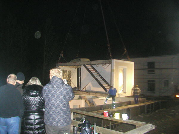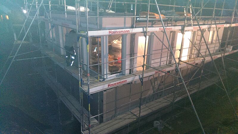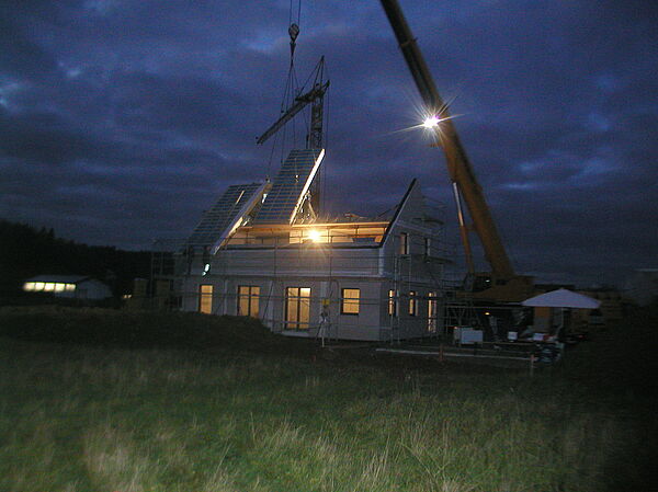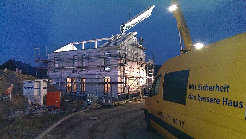 Natürlich können die geschulten Montagespezialisten von DENNERT, Häuser auch bei Tag aufbauen. Hier spiegelt sich die Präzision der Fertigungsstrasse, der Transportlogistik und die Erfahrung der Monteure wider!